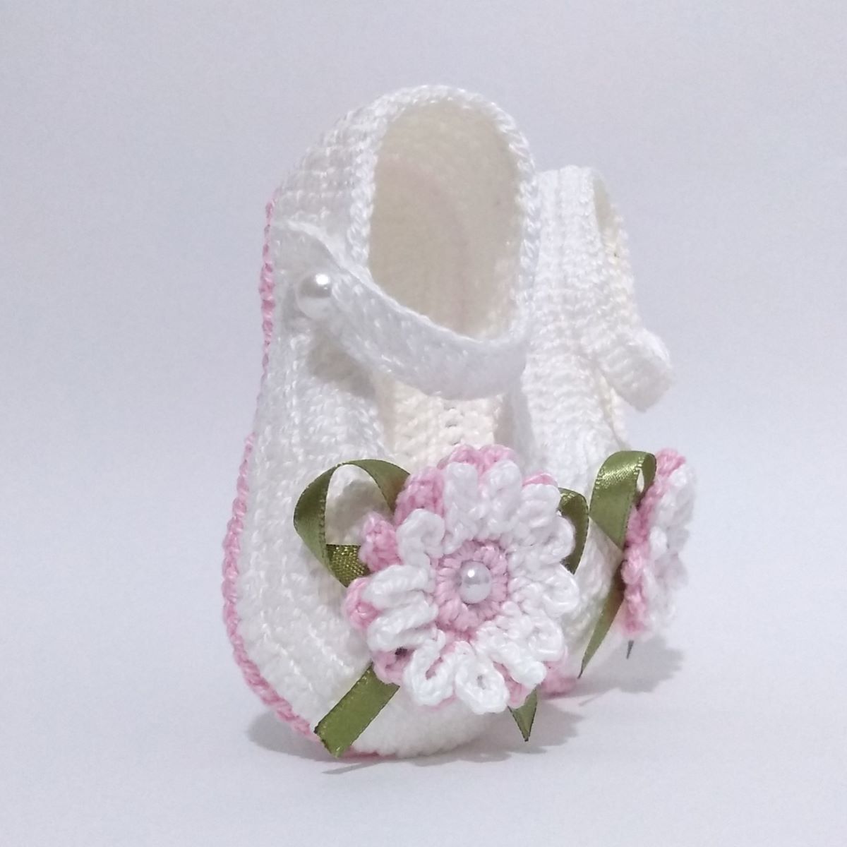Sapatinho de crochê feminino branco e rosa bebê; flor branca e rosa bebê; botão e pérola brancos; lacinho verde.