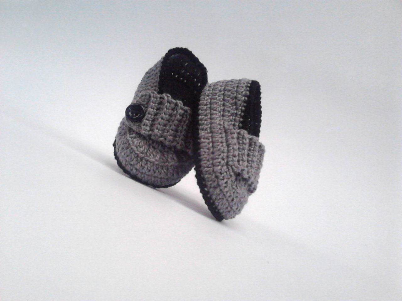 Sapatinho de croche de menino cinza e preto com botão preto.